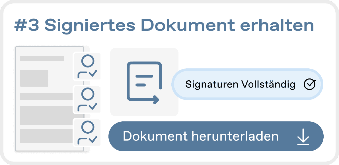 Nach Eingang aller Scans der erforderlichen Unterschriften ordnet FinHand Sign das Dokument und fertigt es als PDF aus. Dann ist das Dokument wirksam zustandegekommen und es steht den Beteiligten zum Download bereit. Schließlich werden die physischen Originale per Post an eine Partei versendet, die die Originalurkunde zusammensetzt.