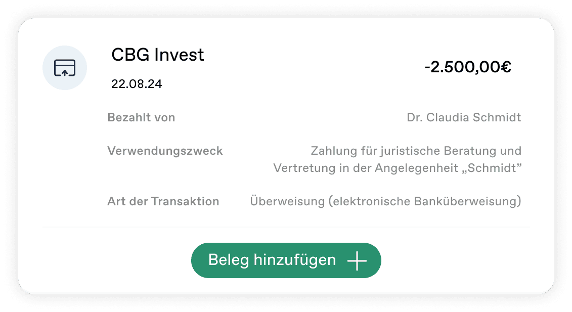 Zentralisieren & vereinfachen Sie Ihre Belegverwaltung mit unserer integrierten Belegerfassung. Verknüpfen Sie Zahlungen und Belege digital, um alle Dokumente übersichtlich und sicher an einem Ort zu speichern.