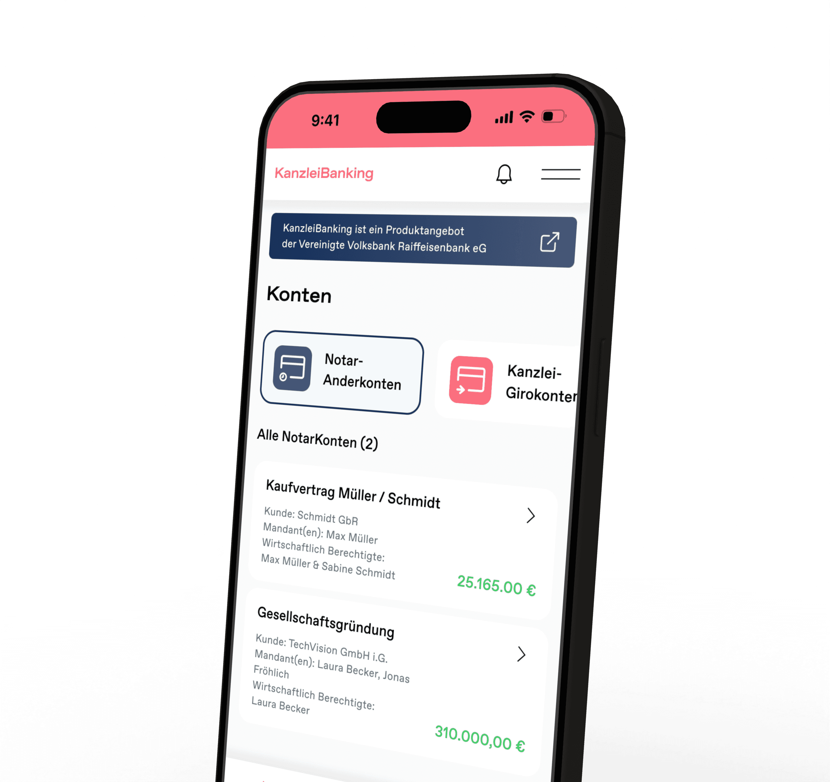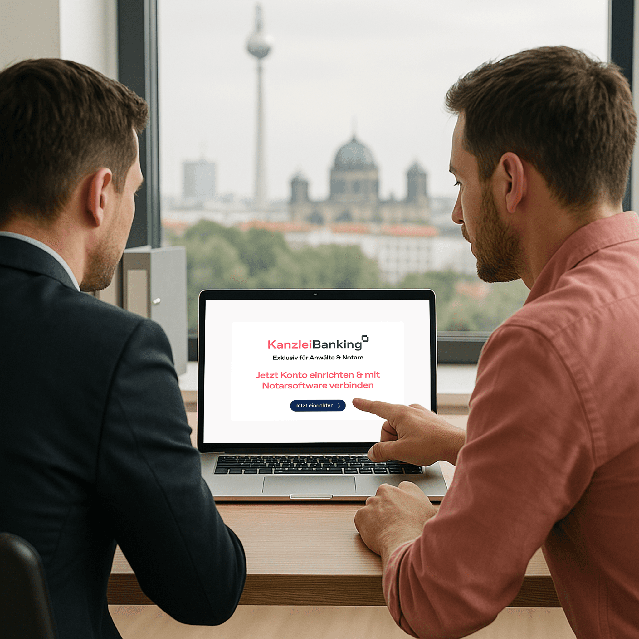 Rechtssicher, schnell und kostenfrei: KanzleiBanking vereinfacht Ihre notariellen Bankgeschäfte. Als einzige Bank in Deutschland bieten wir die voll-digitale Notaranderkontenführung – von der Eröffnung über die XNP-Eintragung bis zur Dokumentation in der elektronischen Akte.